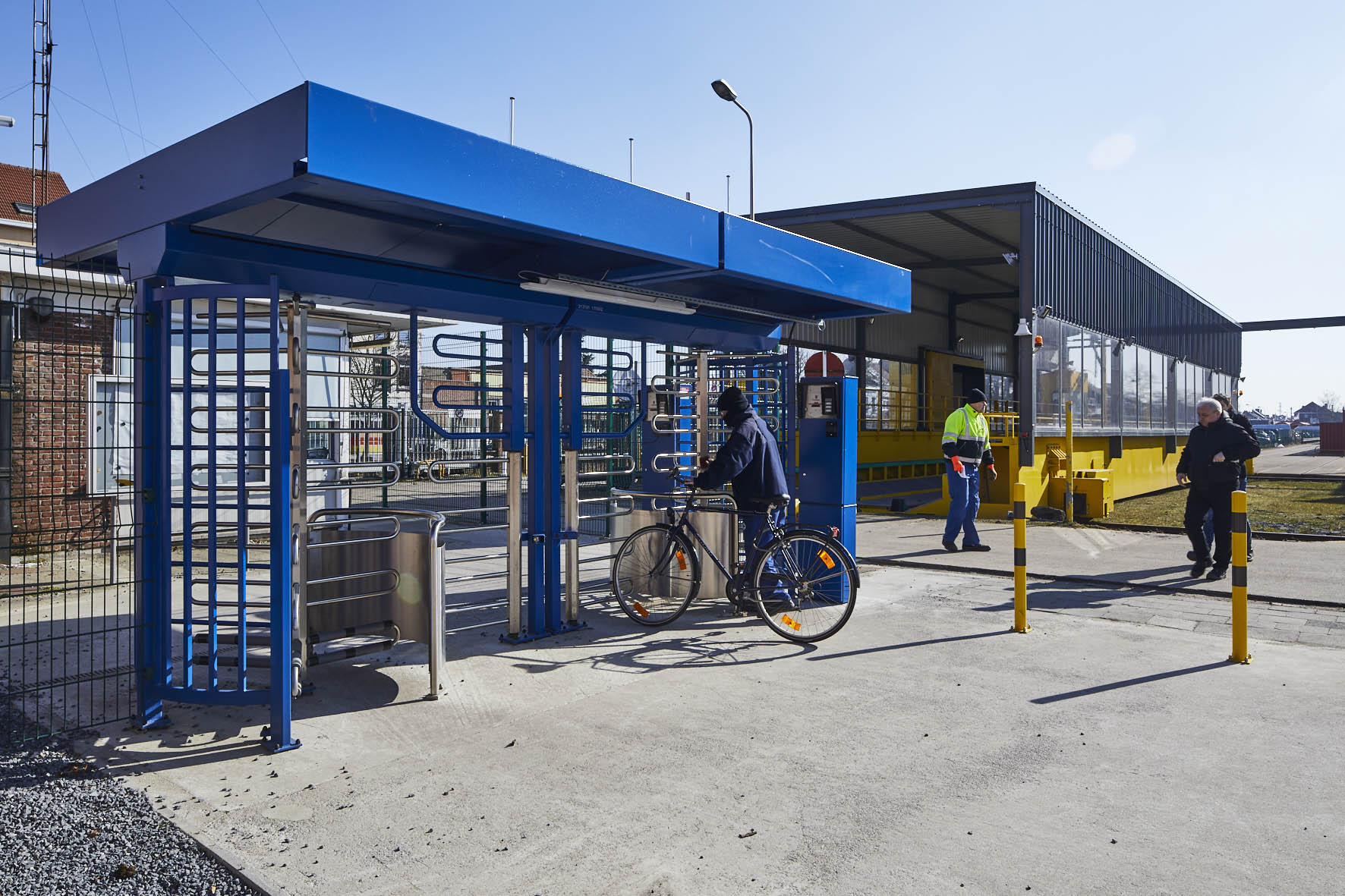 Ein Drehkreuz mit Fahrradzugang ist die Lösung für Besucher mit einem Fahrrad. Mit dem Fahrrad zur Hand trittst du hinein. Ein 1 m hoher Zaun trennt den Fußgängerzugang vom Fahrradzugang.